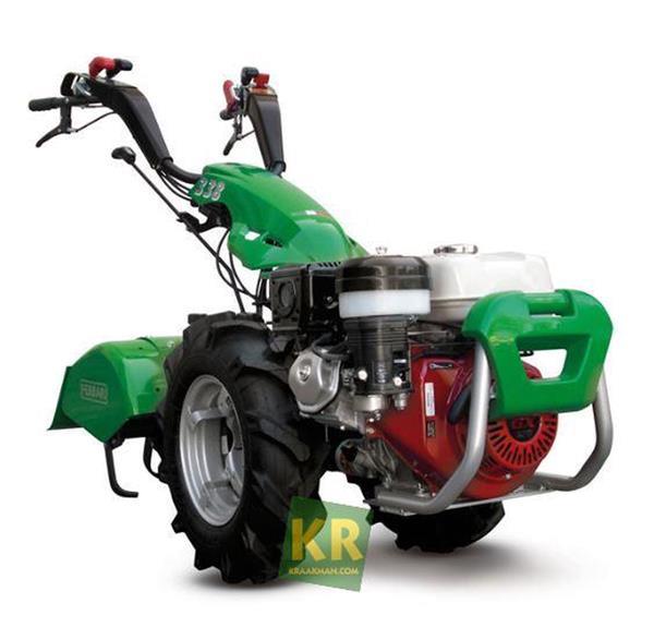 338 PS serie 7.5-10.7 Pk / 5.5-8 kW Benzine Demo machine, gebruikte machine De 338 tweewielige tractor, ook wel bekend als tuinfrees, is ideaal voor diverse toepassingen in groenonderhoud en teeltwerkzaamheden. De machine is voorzien van een versnellingsbak met 3 vooruit en 3 achteruit versnellingen en een snelle omkeerinrichting om de rijrichting te veranderen. Het differentieel met slot maakt de machine praktisch en beheersbaar. De parkeerrem is onafhankelijk van beide wielen. Het stuur is verstelbaar en omkeerbaar, en maakt het mogelijk zowel voor als achter aanbouwwerktuigen te monteren. De 338 is een machine waar diverse aanbouwwerktuigen voor beschikbaar zijn, zoals een frees, rotorkopeg, ploeg, maaibalk, klepelmaaier of veegborstel. Dit maakt ‘m zeer geschikt voor allerlei werkzaamheden, zowel voor thuis als professioneel gebruik.